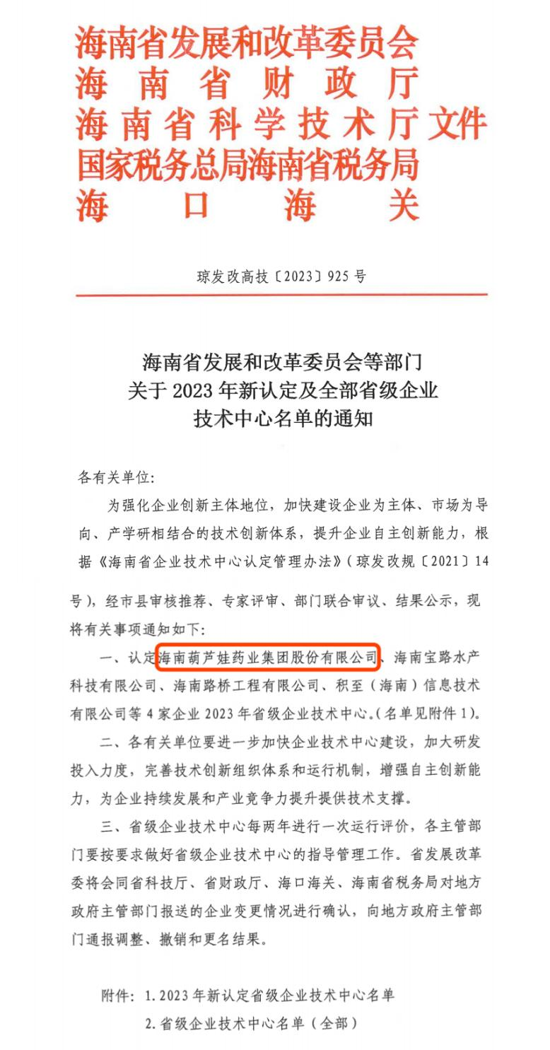 近日,海南省发改委等多部门联合公布了《关于2023年新认定及全部省级企业技术中心名单的通知》,其中,海南利来w66药业集团股份有限公司成功通过评审,被认定为省级企业技术中心,是本次获批的4家企业之一。